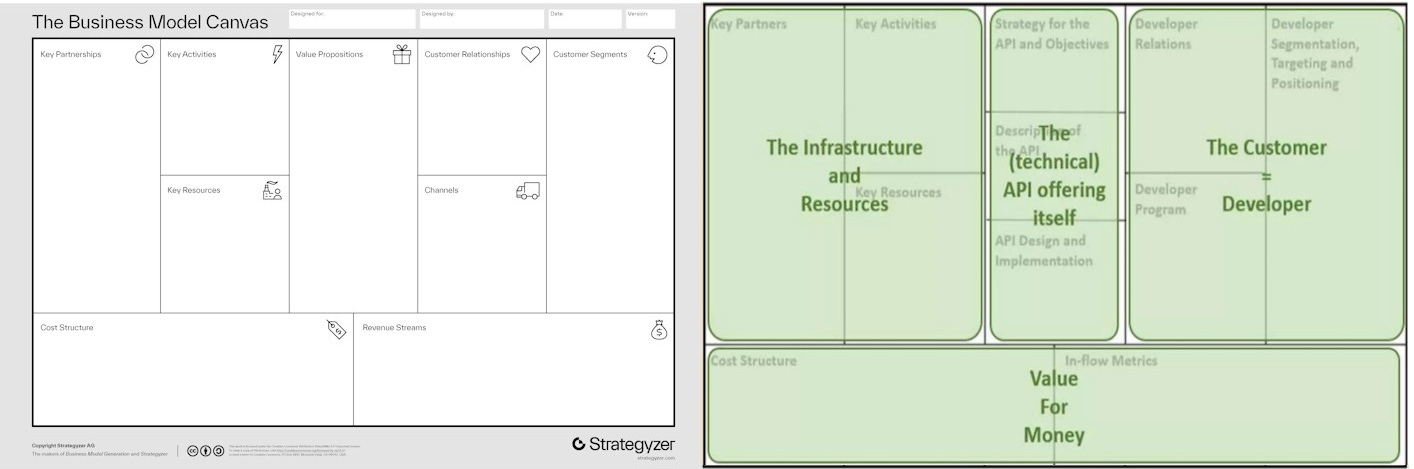 The first API-related Canvas reference I uncovered during research was in a 2015 presentation from Manfred Bortenschlager. As shown below, there are some clear allusions to the Business Model Canvas, but with some tweaks: replacing Customers with Developers and swapping revenue streams for "in-flow metrics".